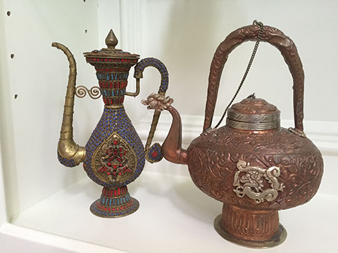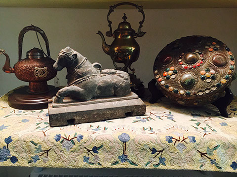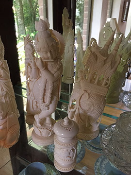 SOUTH EAST ASIAN ART, TEXTILES, SILVER JEWELRY, COPPER AND BRASS; LIMOGES PLAQUE; ENAMELED PLAQUES FROM SWEDISH EXHIBITION; STONE CARVING OF A RHINOCEROUS; NATIVE AMERICAN PLAINS INDIAN BEADED CUFFS; JEWELED, COMPOSITION MINIATURES, HAND PAINTED; PRE-COLOMBIAN ARTIFACTS; BONE CARVINGS; CARVED WOODEN ANIMAL SCULPTURES; PEWTER; TABLE AND LAP LINENS; VINTAGE CHRISTMAS DÉCOR; TOYS; COLLECTION OF HAND SEWN AND HAND CARVED DOLLS REPRESENTING THE AMERICAS, SOVIET UNION, EUROPE, AND ASIA; CANDY SCALES; JEWELRY BOXES; RADIO CONTROLLED CESSNA PIPER CUB AIRPLANE; BACCARAT CHANELIER; PAPIER MACHE DRESS FORM, 1885; VINTAGE PAPIER MACHE MALE MANNEQUIN; STAINED GLASS WINDOW; HUMMEL FIGURINES; CHINESE LAQUERED CABINET, MINIATURE; COLLECTION OF SILK SARIS,EMBROIDERED; ETHNIC JEWELRY; GODET PRINTS, CURRIER AND IVES PRINTS; ANTIQUE KITCHEN TOOLS AND TINWARE; AFRICAN MASKS AND STONE CARVINGS; LADIES AND GENTS WARDROBES; TOLEWARE; FIREPLACE EQUIPMENT; MACKENZIE-CHILDS CHAIR;