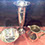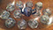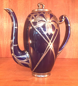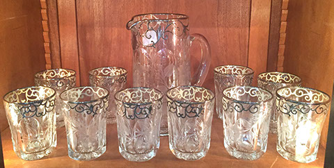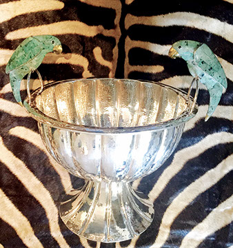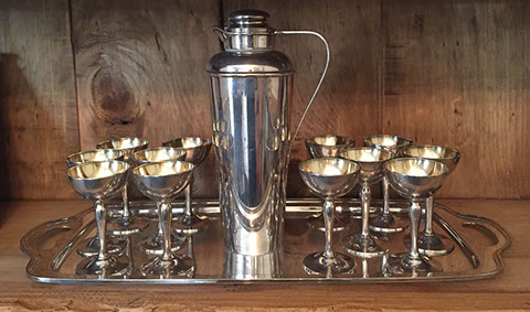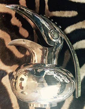 Sterling Silver and Silver Plate: Holloware and Flatware, Sterling overlay crystal sets, Impressive Silverplated Los Castillo Toucan pitcher, Los Castillo punch bowl with turquoise parrot handles, American coin silver, Rare Gorham Sterling Martini Shaker with 12 glasses and a matching drinks tray.
