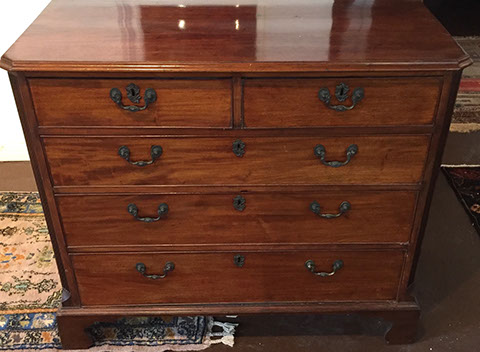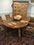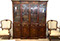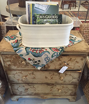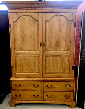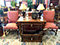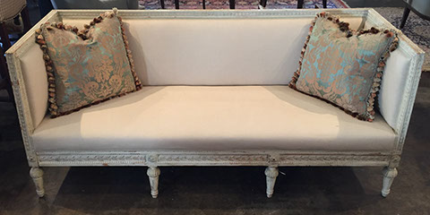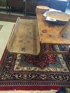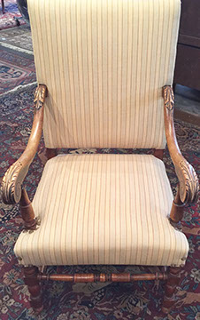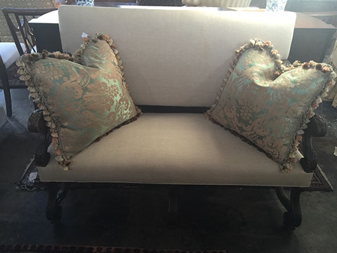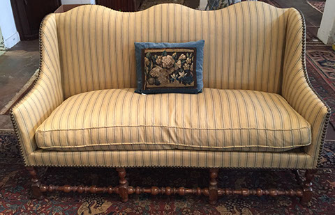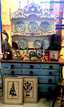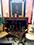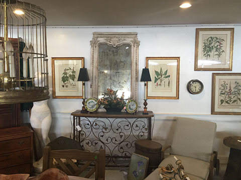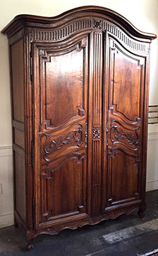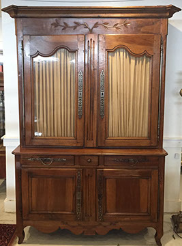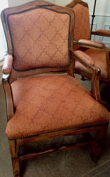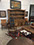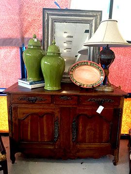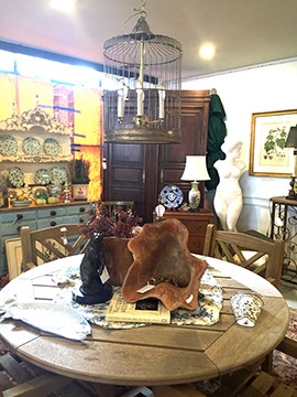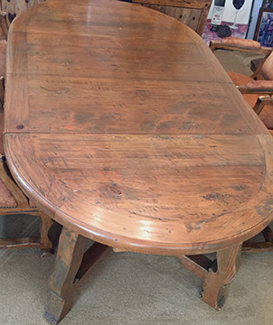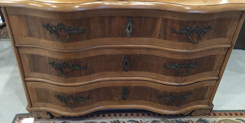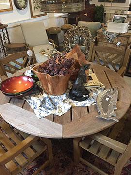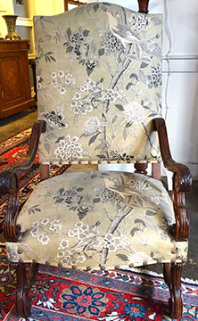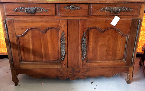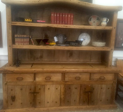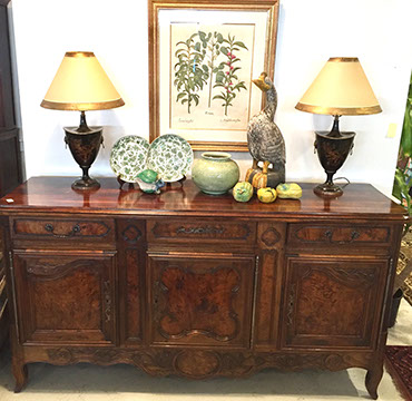 Furniture: English, French and American antiques; Traditional, Upscale Aspen Style, Country French, and Contemporary furnishings: Country French carved armoire, English burl wood breakfront, Mahogany sideboard, Country French sideboard, Black leather-topped French desk with ormolu trim, Needlepoint Prie-dieu, Antique Peruvian chest, Country French armoire with curtained cupboard, French Provincial fireplace surround, Round cement topped table on teak base, Linen upholstered sectional, Two Aspen style king size log bed frames, Pair of Hand painted silk upholstered French armchairs, Hand carved Pine armoire, Hand painted German wedding chest, Hand painted German wedding chest of drawers, linen floral covered poof, Painted French furniture pieces, English carved oak settee, Carved English oak table dated 1697, Aspen style dining table and four leather upholstered chairs, six carved branch dining chairs with Kilim seats, Leather sofa, Two German wall clocks; Numerous pieces of cozy, cottage-type upholstered chairs, sofas, settees, Teak and painted garden furniture